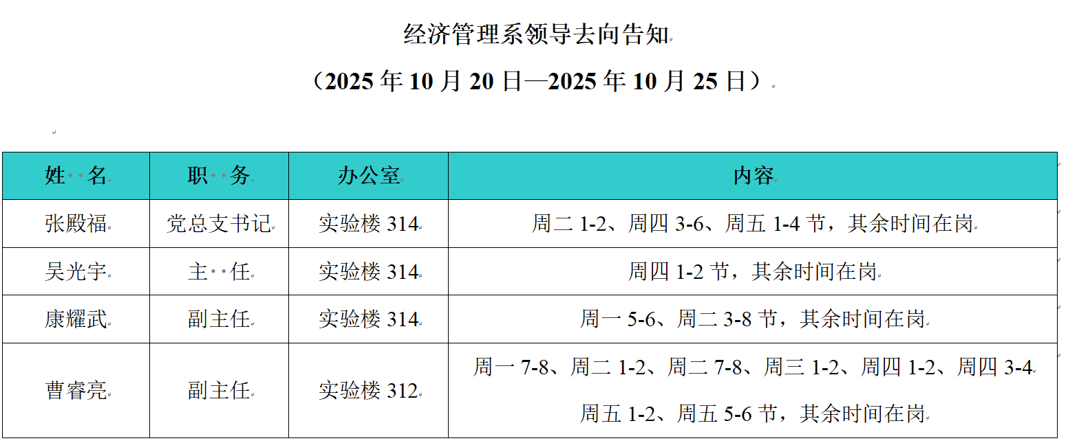 经济管理系领导去向告知(2025年10月20日—2025年10月25日)