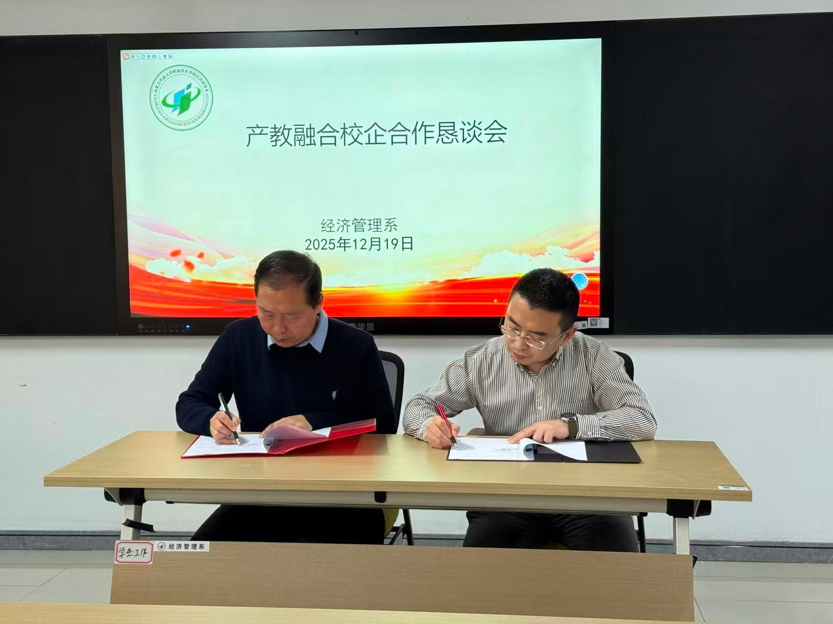 在产业洞察分享环节,各院校与会教师与企业代表围绕数智经济背景下企业对经管人才的期许与挑战,聚焦产业转型升级对人才知识、技能与素养的最新要求,展开深入交流。与会嘉宾分别就数字营销与电子商务人才共育、智慧财务与金融科技课程共建、现代物流与供应链管理项目共研、创新创业实践与孵化基地共建等关键议题分享见解,为校企合作精准对接提供了宝贵思路。期间,吴光宇老师还专门介绍了经济管理系产业学院的具体发展规划,让在场嘉宾对合作路径有了更清晰的认知。恳谈会现场,经济管理系与4家企业签署校企合作协议。
