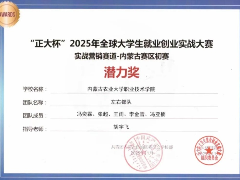 备赛过程中,指导教师针对各赛道要求,为参赛学子提供项目策划、实战运营等全流程指导;参赛学生则结合市场营销等专业知识,打磨项目方案、开展实战演练,在赛场中展现出扎实的专业功底与团队协作能力。最终,我系两支团队凭借各具特色的项目设计和出色的实战表现,均获评内蒙古赛区初赛“潜力奖”。