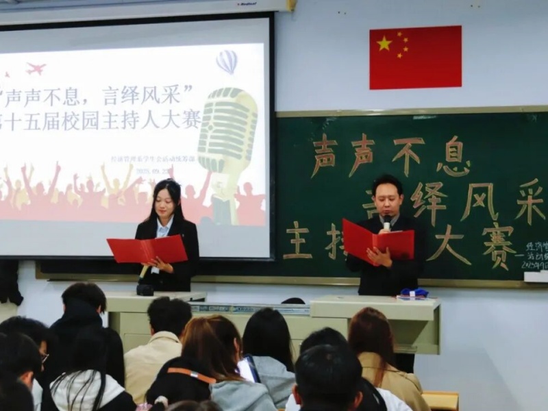 青春之声,响彻校园舞台;言绎风采,闪耀梦想光芒。经济管理系“声声不息,言绎风采”第十五届主持人大赛初赛于2025年9月23日19时在教学楼A104教室隆重举行。众多怀揣主持梦想的学子齐聚一堂,展开了一场精彩绝伦的语言盛宴。
