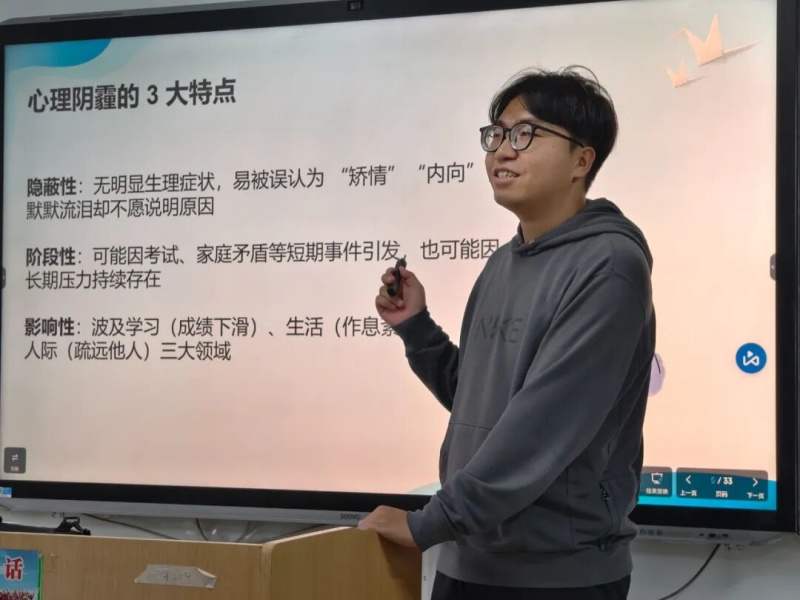 讲座伊始,张己炳老师围绕“什么是心理阴霾”展开解读,从具体维度来看,情绪上表现为心境低落、兴趣减退;行为上常出现社交回避、行动力下降等表现;认知层面则易产生负面思维、自我怀疑等倾向,这些表现共同构成了心理阴霾的核心特征。针对心理阴霾的特点,张己炳老师重点阐释了三大核心属性:隐蔽性、阶段性和影响性。