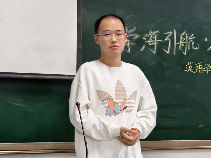 分享环节中,李佳轩同学结合自身英语学习经历,以“考驾照”等贴近生活的实例为切入点,生动讲解了如何将英语学习自然融入日常生活。他重点强调,英语学习应避免盲目碎片化积累,引导同学们在理解与兴趣驱动下主动学习,让大家深刻认识到英语在个人成长与专业发展中的重要关联价值。