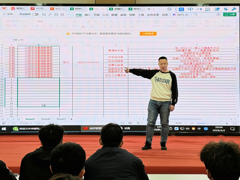 为进一步规范学生综合素质测评流程,明确工作标准,提升工作质效,切实保障测评工作公平、公正、公开开展,2026年3月2日19时,经济管理系学生综合素质测评专题培训会在一站式学生社区顺利召开。经济管理系学办副主任胡宇飞老师、辅导员张己炳老师、杨丹老师出席本次会议。