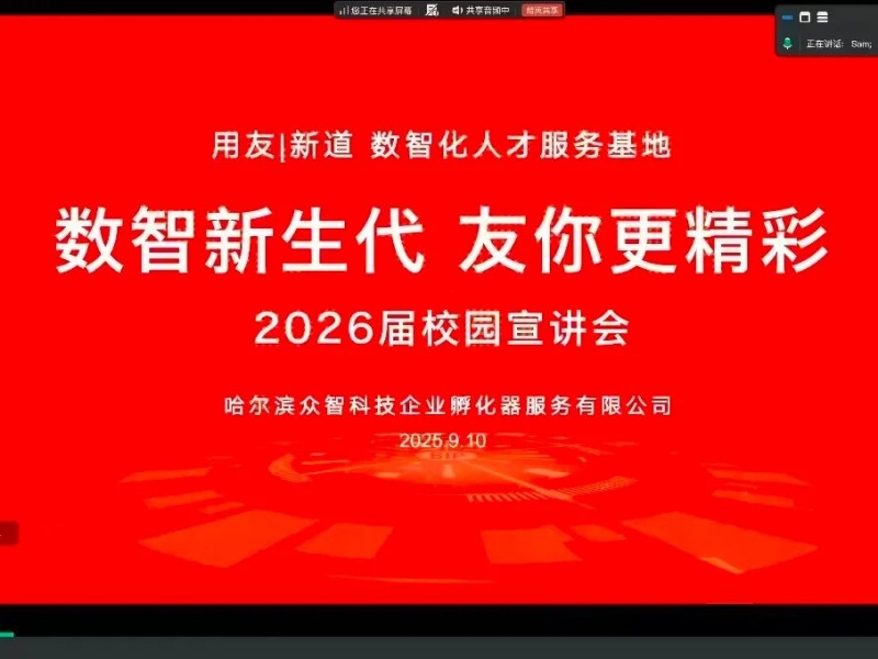 2025年10月24日19时,由哈尔滨众智科技企业孵化器服务有限公司承办的“数智新生代 友你更精彩”用友新道数智化人才服务基地2026届校园宣讲会成功在线上举办。本次宣讲会聚焦数智化人才培养与职业发展,为2026届学子搭建了数智化领域的职业发展桥梁。
