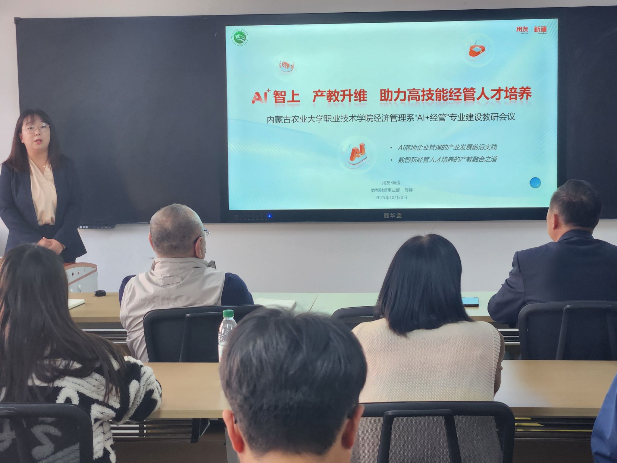 为紧跟人工智能产业发展浪潮,深化产教融合育人模式改革,10 月 30 日,内蒙古农业大学职业技术学院经济管理系举办 “AI + 经管” 专业建设教研会议。会议特邀数智会计产业学院合作企业——用友新道数智财经事业部专家陈静作专题分享,系部全体教师参会研讨,共同擘画数智新经管人才培养蓝图。